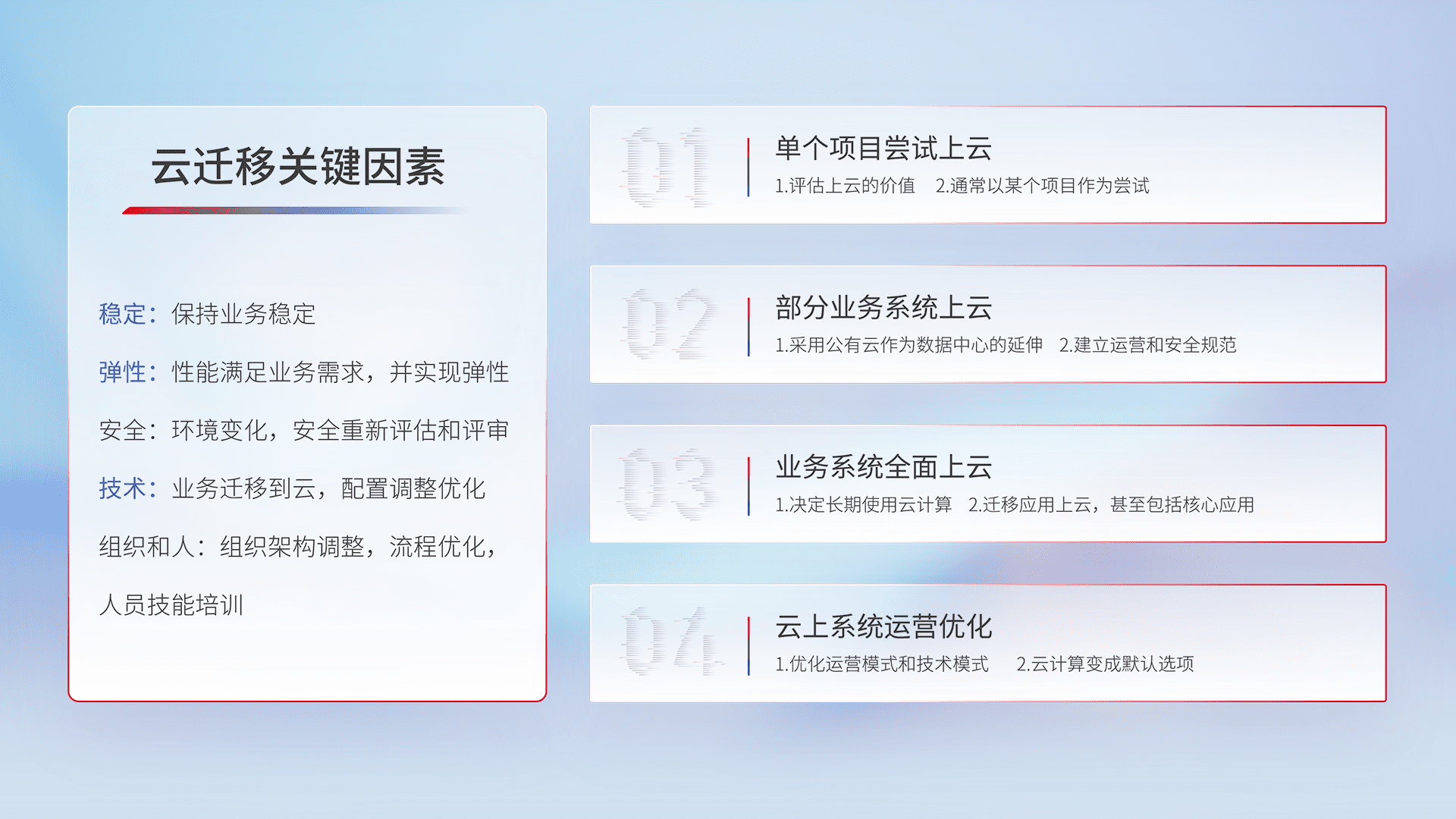 结合实际业务,,从规划设计、、、云平台选型、、、云原生改造、、数据迁移、、、集成交付,,,迁移全过程为客户识别最佳上云路径,,,,做好风险识别管理,,,,设计网络架构、、身份权限、、、、安全审计合规、、、操作审计、、、、日志审计、、、监控告警策略、、多站点容灾设计等,,,对云上基础设施进行整体规划,,,,提升IT治理水平,,,,以满足弹性、、高可用、、、高性能的需求。。。