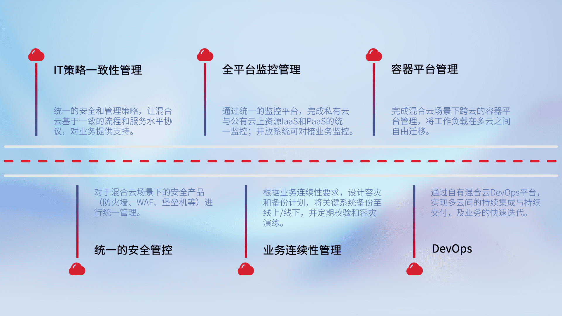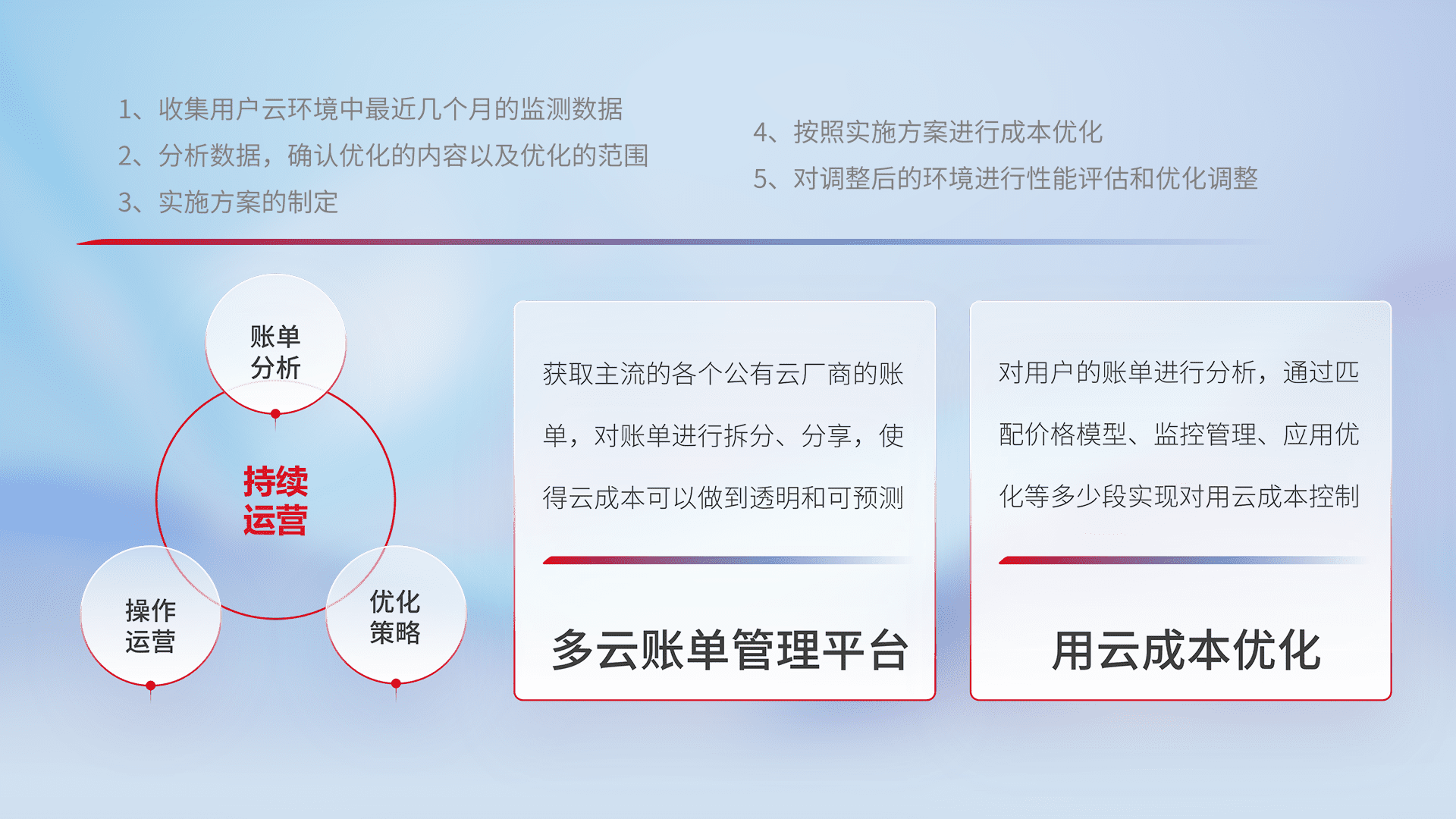 通过多云纳管,,,,以统一的资源数据模型把客户的云资源进行抽象和封装,,进而实现对多云资源的统一操作,,,,保障云资源管理的可靠性、、、稳定性与可用性。。。。量身定制化运维内容,,,配置、、、开发运维、、、、补丁管理、、、、备份、、、、监控、、、、认证和访问管理、、审计和日常巡检等,,保障在用云过程中的可靠度,,,,稳定度以及高可用率。。